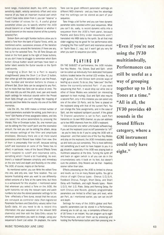 A JV-30 tone is composed by one or various PCM multisample - internal samples cannot be really edited just like previous classic digital model Roland U-20. Internal ROM (3 X IC) wavetable features 445 tones (317 GS + 128 drums) or samples at 16 bits resolution mainly derived from classic Roland Canvas SC-55. Each tone offers 8 variations presets ready to go, easily accessible from panel. JV sounds are organized in instruments families (eg: brass, piano, orchestral) mostly bread and butter sounds